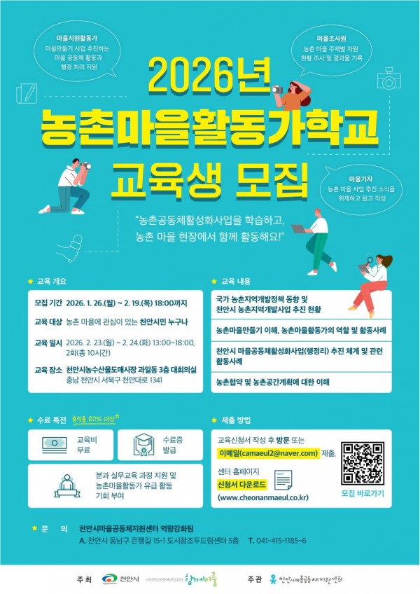 천안시마을공동체지원센터는 농촌 현장 중심의 전문 인력 양성 성과를 바탕으로 「2026년 농촌마을활동가학교」 교육생을 모집한다. 농촌마을활동가학교는 2016년부터 지난해까지 300명 이상의 수료생을 배출하며 지역 농촌마을 현장과 연계한 인적자원 육성에 기여해 왔다.