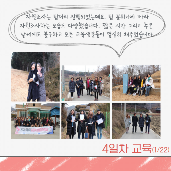 글제목 : 2020 제4기 농촌마을활동가학교 - 3,4일차 교육 후기 페이지 정보 작성자 관리자 작성일 20-02-18 16:38 본문 . 목록 이전글2020 제4기 농촌마을활동가학교 - 1,2일차 교육 후기 20.02.18 다음글2020 제4기 농촌마을활동가학교 - 5,6일차 교육 후기 20.02.18