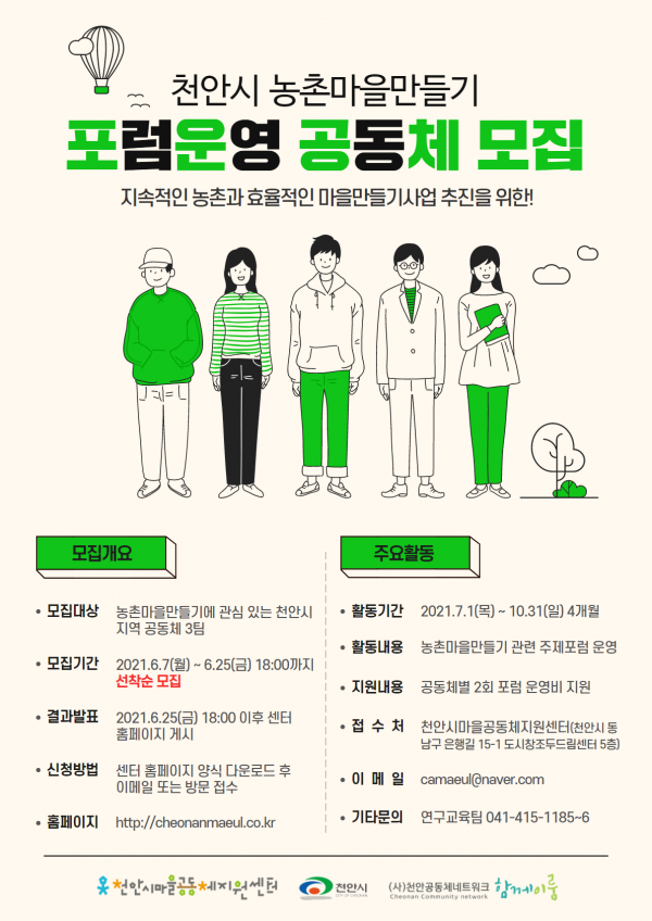 천안시마을공동체지원센터는 천안시 농촌마을만들기 관련 정책 및 제도 개선을 위해 지역 주체별 포럼 운영을 지원합니다. 아래와 같이 모집 하오니 농촌마을만들기에 관심 있는 지역 공동체의 적극적인 참여 부탁드립니다.