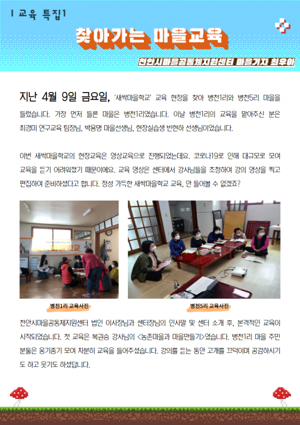 글제목 : [4월호 뉴스레터 - 특집] 찾아가는 마을교육 페이지 정보 작성자 관리자 작성일 21-04-29 17:24 본문 . 목록 이전글[2021 천안시 농촌마을만들기 아이디어공모전] 대학생이 간다 모집공고 21.04.17 다음글[4월호 뉴스레터 - 특집] 사업계획서 작성교육 21.04.29