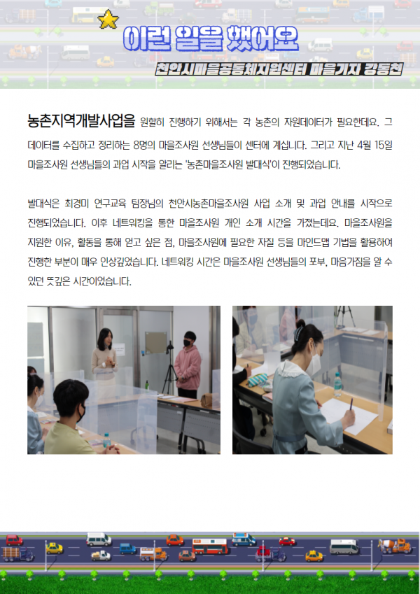 글제목 : [4월호 뉴스레터 - 고정] 이런 일을 했어요 페이지 정보 작성자 관리자 작성일 21-04-29 17:26 본문 12 목록 이전글[4월호 뉴스레터 - 고정] 마을 이모저모 21.04.29 다음글[4월호 뉴스레터 - 고정] 이런 사업 할거에요 21.04.29