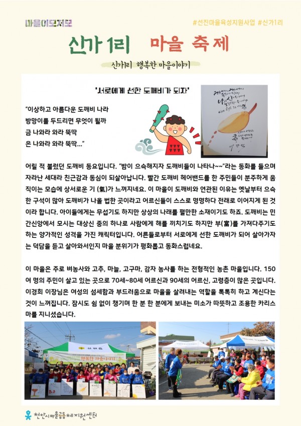 글제목 : [12월호 뉴스레터-이달의 마을소식] 신가1리, 안궁3리 마을축제 개최 페이지 정보 작성자 관리자 작성일 22-12-29 14:16 본문 목록 이전글[12월호 뉴스레터-예정사업] 2023년 센터 운영방향 22.12.29 다음글[12월호 뉴스레터-센터소식] 충남농촌마을대상, 시뮬레이션워크숍 참석 22.12.29