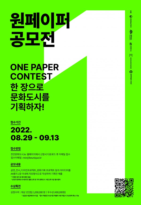 천안문화도시센터에서는 공연, 전시, 디자인 프로젝트, 문화기획 프로젝트 등 다양한 아이디어를 A4용지 1장 안에 뽐낼 수 있는 원페이퍼 공모전을 진행합니다. 관심있으신 분의 많은 참여 부탁드립니다.