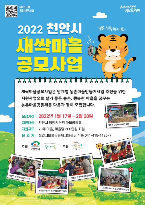 글제목 : 2022 새싹마을공모사업 참여 마을 모집 페이지 정보 작성자 관리자 작성일 22-01-24 16:35 본문 새싹마을공모사업은 단계별 농촌마을만들기사업 추진을 위한지원 사업으로 마을만들기사업에 경험이 없는 살기 좋은 농촌, 행복한 마을을 꿈꾸는 농촌마을공동체를 모집합니다 첨부파일 모집공고문2022 새싹마을공모사업.hwp (66.5K) 42회 다운로드 | DATE : 2022-01-24 16:35:44 목록 이전글[2022 천안시농촌신활력플러스사업추진단] 기획생산관리 교육생 모집 공고 22.01.20 다음글[2022년도 농촌마을활동가학교] 교육생 모집 22.02.04