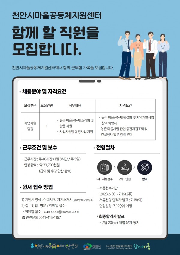 글제목 : 2023년 천안시마을공동체지원센터 3차 직원채용 재공고 페이지 정보 작성자 관리자 작성일 23-06-30 08:44 본문 천안시마을공동체지원센터에서 함께 근무할 직원을 모집합니다.많은 관심 부탁드립니다. 첨부파일 2023년 3차 천안시마을공동체지원센터 직원채용 재공고문.hwp (117.5K) 57회 다운로드 | DATE : 2023-06-30 08:44:38 2023_이력서 및 자기소개서.hwp (193.5K) 27회 다운로드 | DATE : 2023-06-30 08:44:38 목록 이전글2023년 천안시마을공동체지원센터 3차 직원채용 공고 23.06.08 다음글2023년 천안시마을공동체지원센터 3차 직원채용 최종 합격자 공고 23.07.20