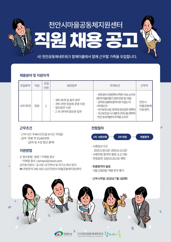 글제목 : 2025년 천안시마을공동체지원센터 채용공고 페이지 정보 작성자 관리자 작성일 25-05-30 15:08 본문 사단법인 천안공동체네트워크 함께이룸에서 함께 근무할 가족을 모집합니다.모집분야: 서무/회계자세한 내용은 첨부파일을 확인하시기 바랍니다. 감사합니다. 첨부파일 2025년 사단법인 함께이룸 직원채용 공고문.hwp (64.0K) 24회 다운로드 | DATE : 2025-05-30 15:08:43 2025년 입사지원서 양식.hwpx (46.2K) 16회 다운로드 | DATE : 2025-05-30 15:08:43 목록 이전글2024년 천안시마을공동체지원센터 2차 직원채용 공고 24.02.14